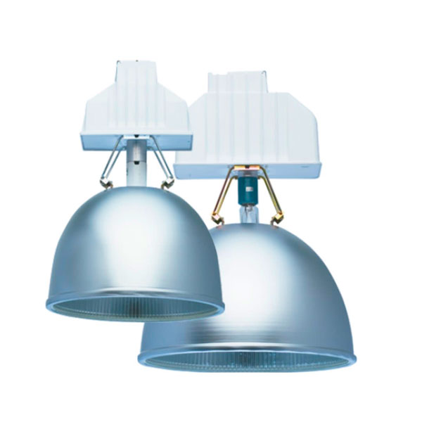 Luminaria industrial tipo high bay en halogenuro y sodio, para uso interno.